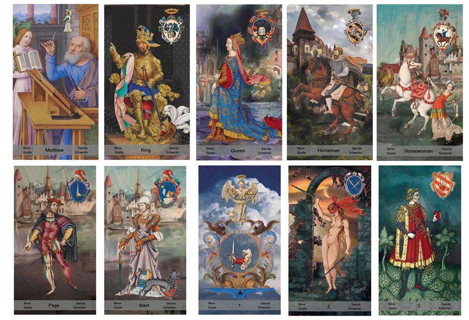 От автора: Я не придерживаюсь общепринятой классификации. Значения будут по Уэйту, младшие будут прорисованы. Дворцовых будет 6, рыцарь и паж — мальчик и девочка. К мастям прибавятся О карта с Лукой, Матвеем и т.п. Нумерация по Марселю — Сила. В 14-16 веке Уэйта не было, только Марсель. Герб Висконти присутствует — поэтому миланское Таро. В общем такое странное Таро, т.е. Таро Странникова…