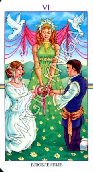 VI — Влюбленные. Соединение рук. Клятва, выбор, искренняя любовь, связь и притяжение противоположностей, преодоление преград.
